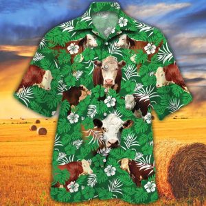 Cow Trendy Hawaiian Shirts Hereford Cattle Lovers Green Floral Pattern Trendy Hawaiian Shirt