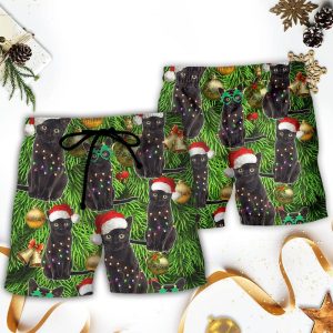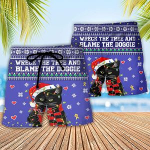 Black Cat Wreck The Tree And Blame The Doggie Merry Christmas La La Trendy KLA Hawaiian Beach Shorts