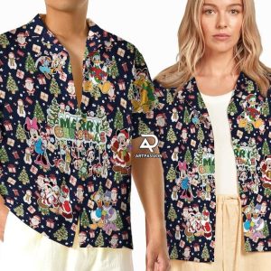 Disney Merry Christmas Hawaiian Shirts Mickey Minnie Button Disneyland Vacation