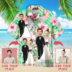 Funny Custom Face Happy Wedding Couple On Tropical Flowers Custom Hawaiian Shirt