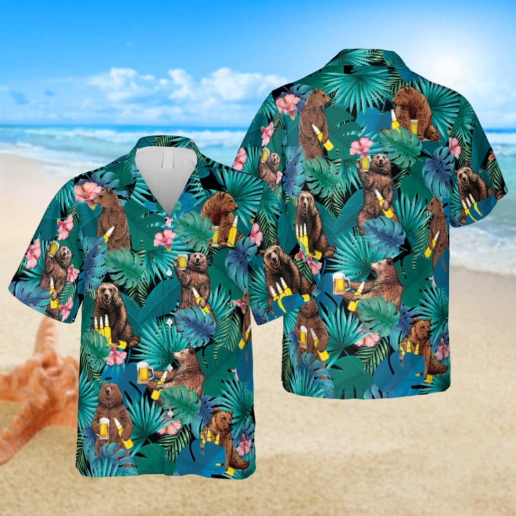 Bear Drinks Beer Hawaii Green Shirt, 3D Camping Shirt