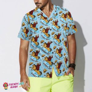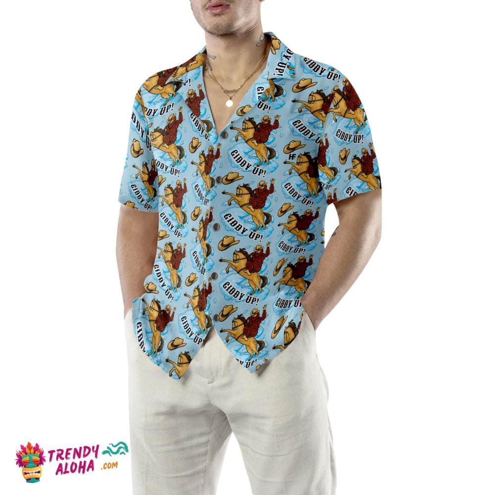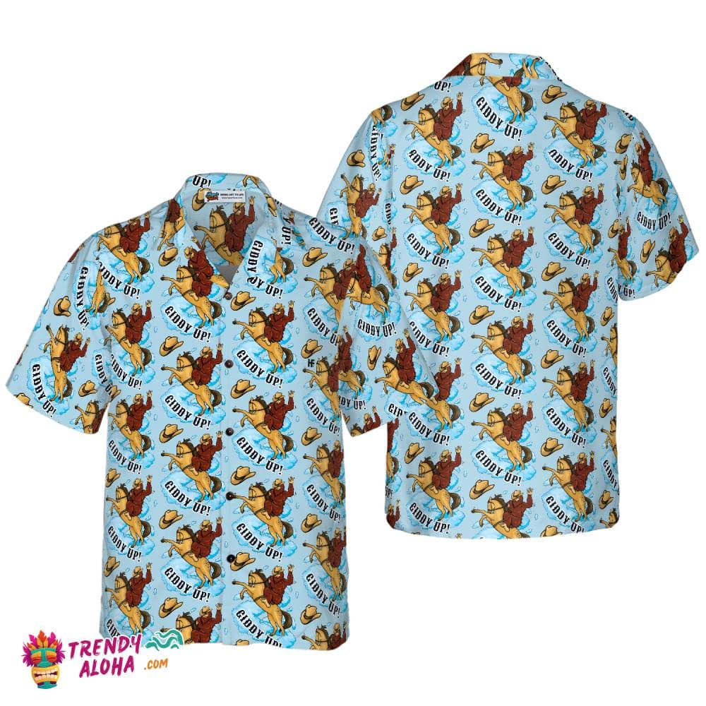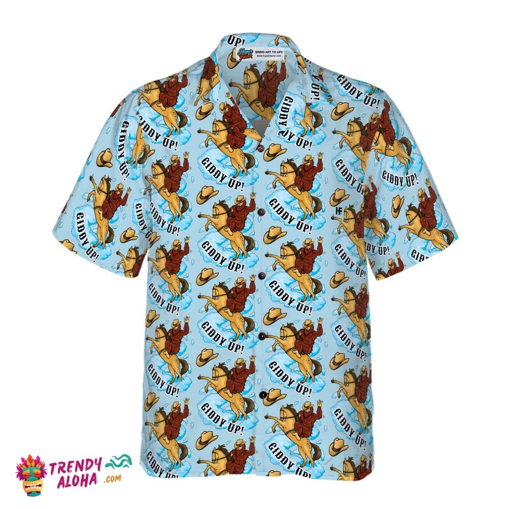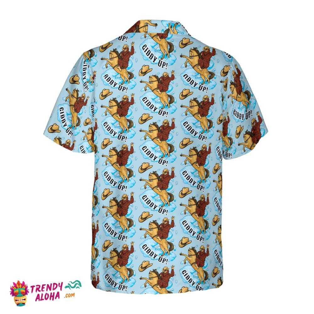 Bigfoot Cowboy Giddy Up Bigfoot Hawaiian Shirt, Sky Blue Vintage Rodeo Horse Riding Bigfoot Shirt For Men