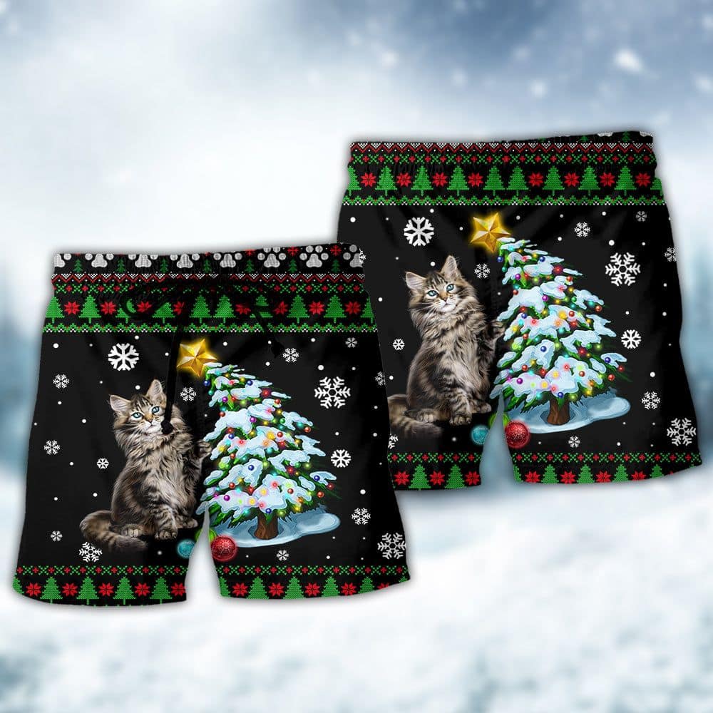 Cat Wreck The Tree Light Funny Ugly Style Christmas Trendy KLA Hawaiian Beach Shorts