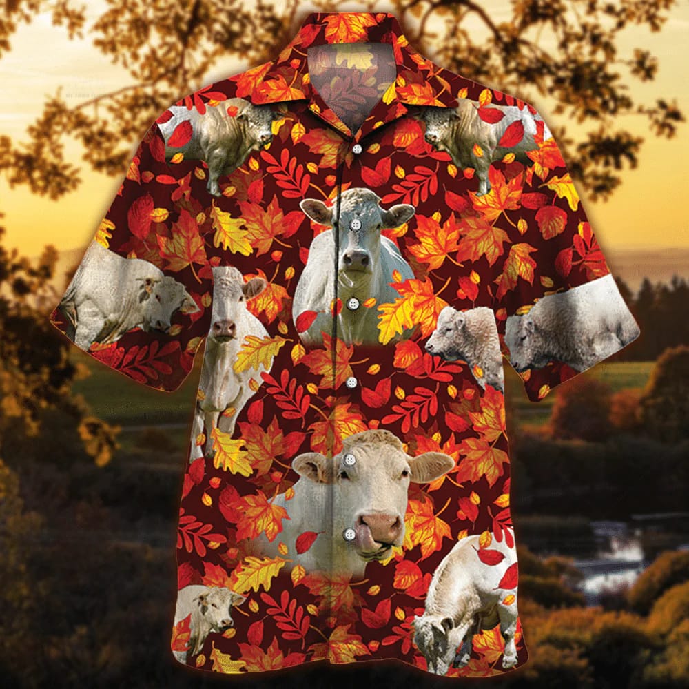 Charolais Cattle Lovers Autumn Red Leaves Trendy Hawaiian Shirt, Cow Trendy Hawaiian Shirt For Summer Gifts
