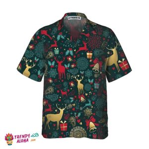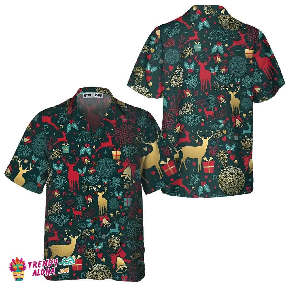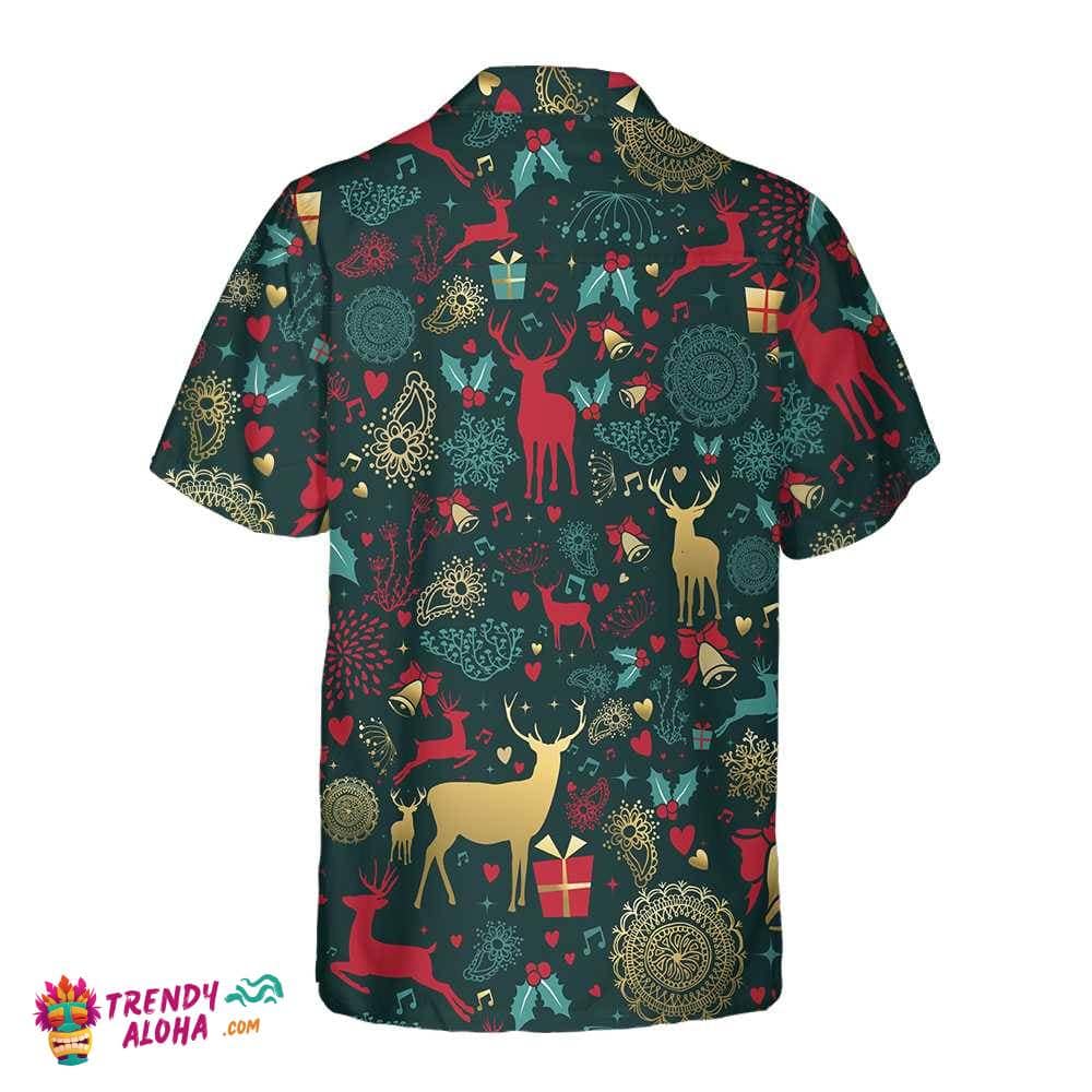 Christmas Golden Deer Pattern Hawaiian Shirt, Christmas Reindeer Shirt, Best Xmas Gift Idea