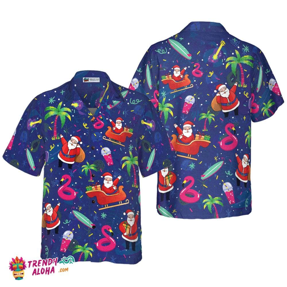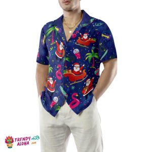 Christmas Hawaiian Shirts, Santa Flamingo Tropical Pattern Shirt Short Sleeve, Christmas Shirt Idea Gift For Men And Women
