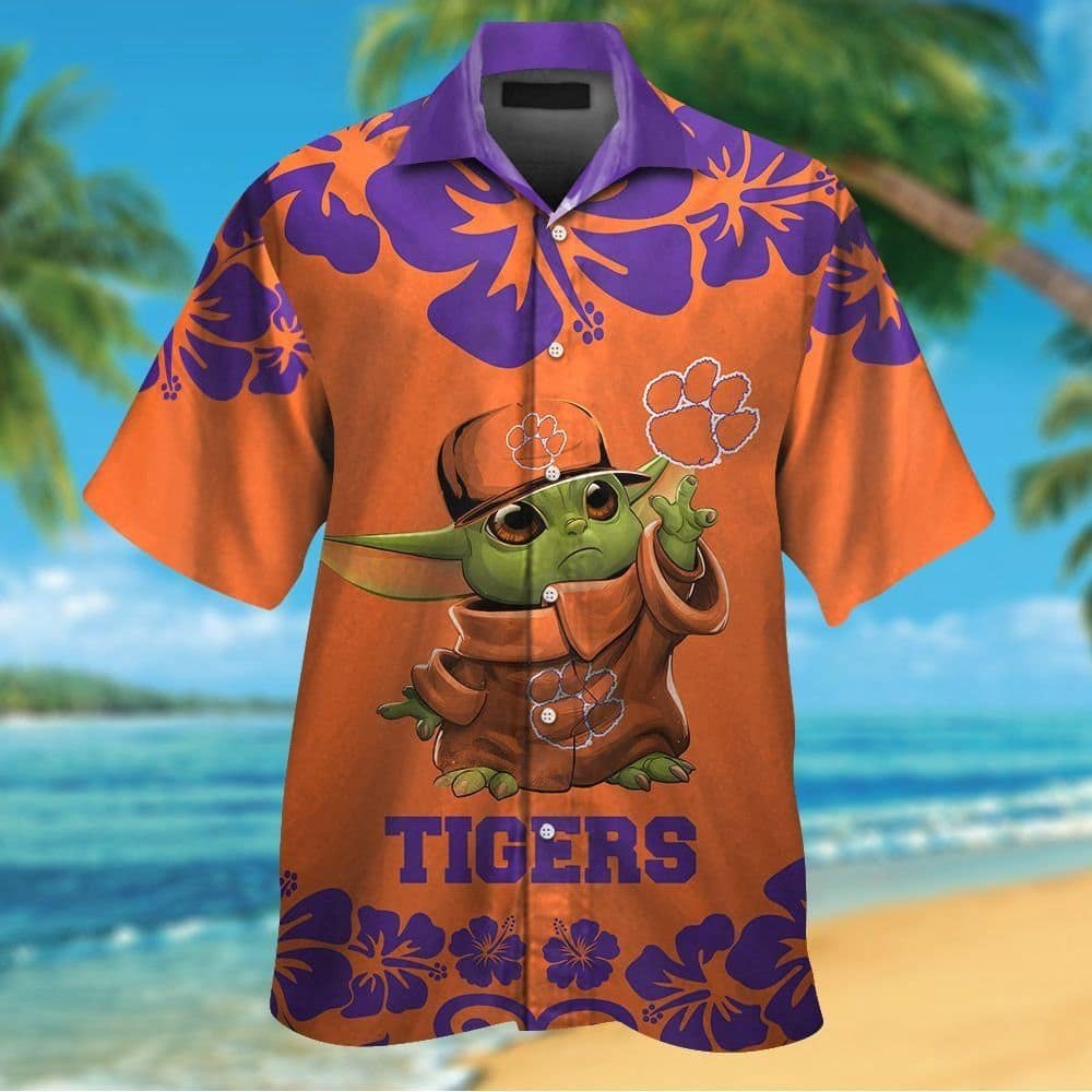 You’re viewing Clemson Tigers Baby Yoda Short Sleeve Button Up Tropical Hawaiian Shirt.