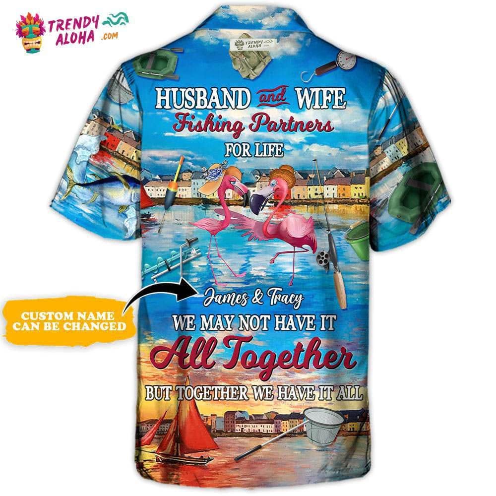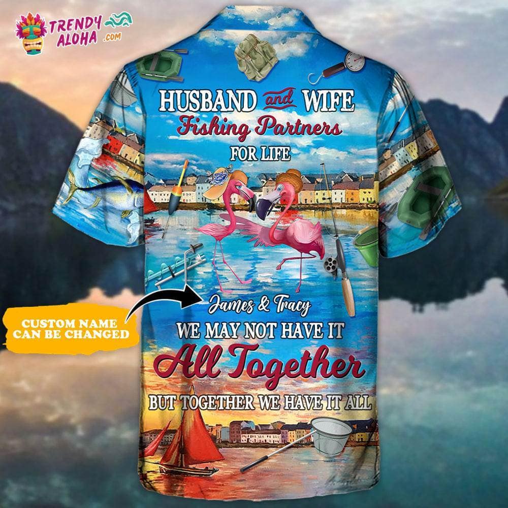 Fishing Flamingo Husband And Wife Fishing Partners For Life Personalized – Hawaiian Shirt – Personalized Photo Gifts Hawaiian Shirt – Trendy KLA