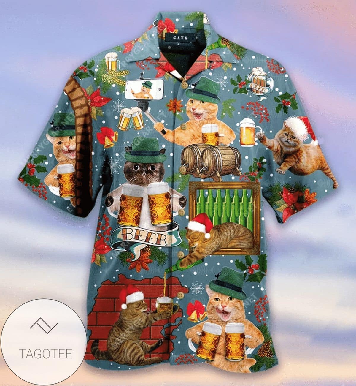 You’re viewing Frolicking Cats Enjoying a Beer on This Fun Hawaiian Shirt.