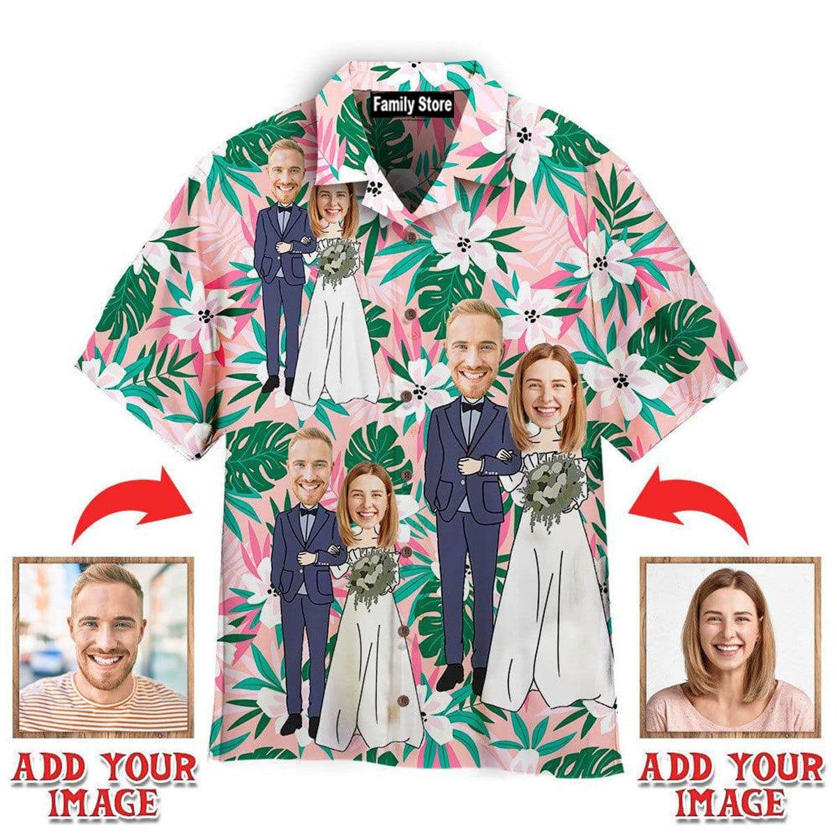 You’re viewing Funny Custom Face Happy Wedding Couple Flower On Pink Tropical Custom Hawaiian Shirt.