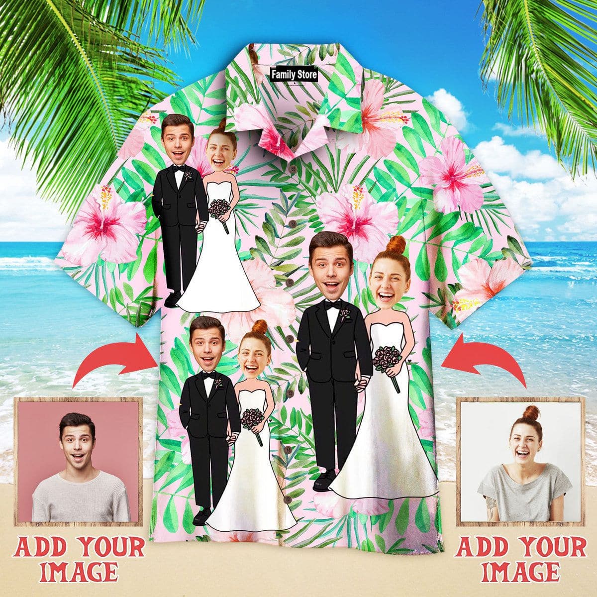 You’re viewing Funny Custom Face Happy Wedding Couple On Tropical Flowers Custom Hawaiian Shirt.