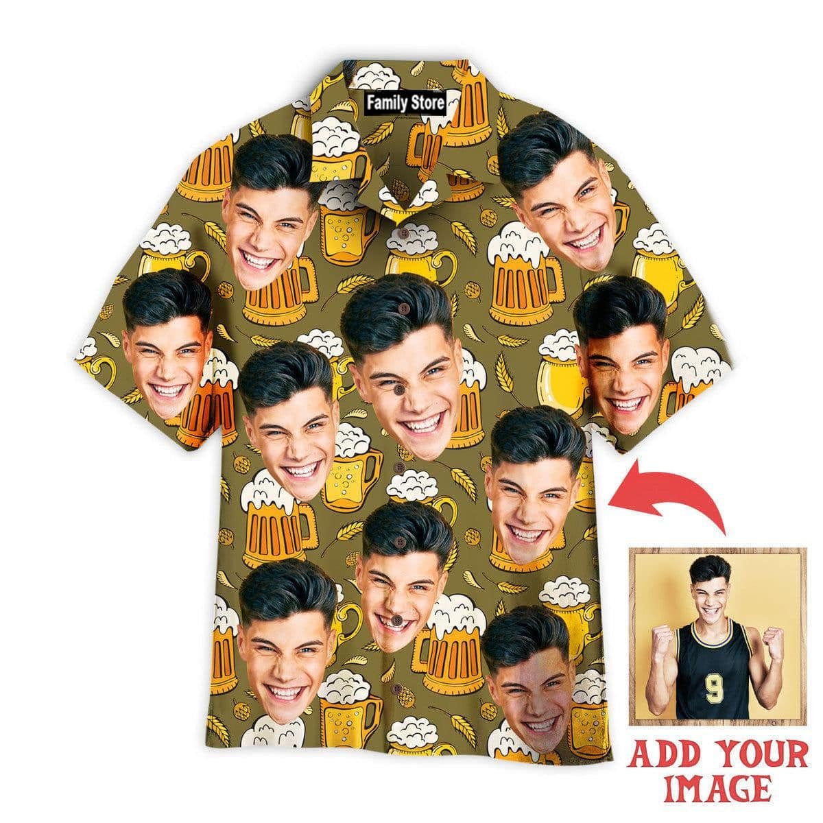 You’re viewing Funny Custom Face Young Guy On Beer Mugs Pattern Custom Hawaiian Shirt.
