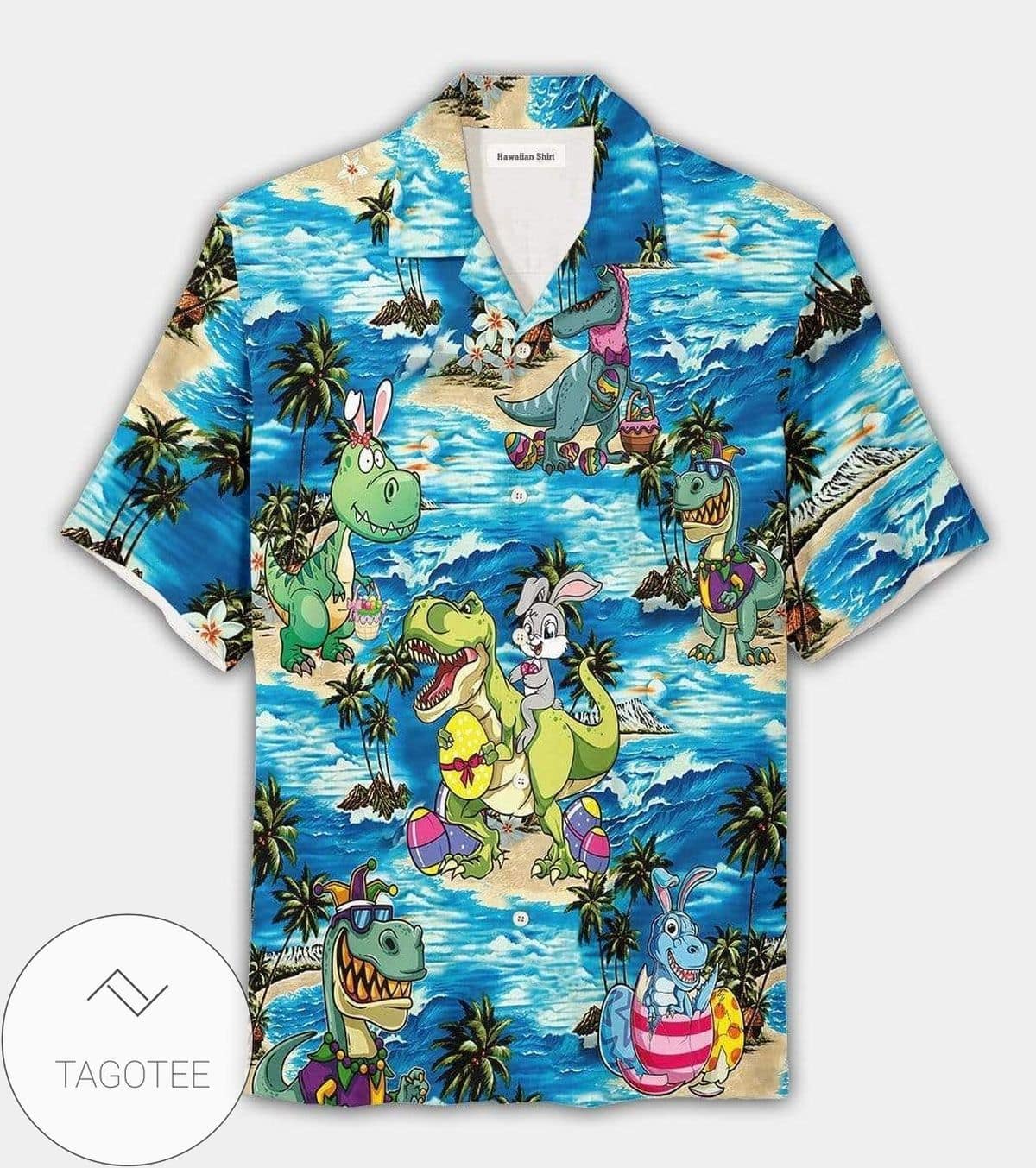 You’re viewing Happy Easter 2021 Funny Bunny Riding Dinosaur Unisex Hawaiian Shirts.