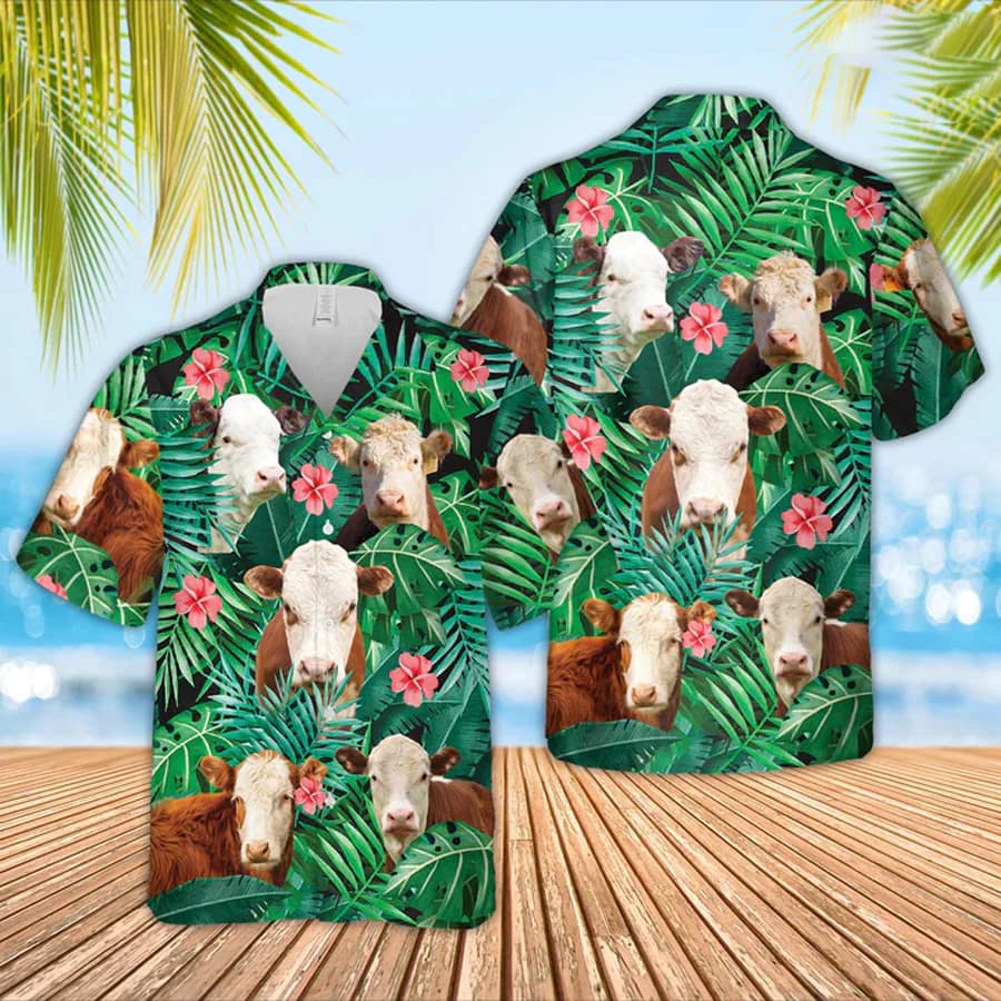Hereford 2 Cow Trendy Hawaiian Shirt, Farmer Trendy Hawaiian Shirts, Summer Tropical Shirts, Gift For Him, Funny Trendy Hawaiian Shirts