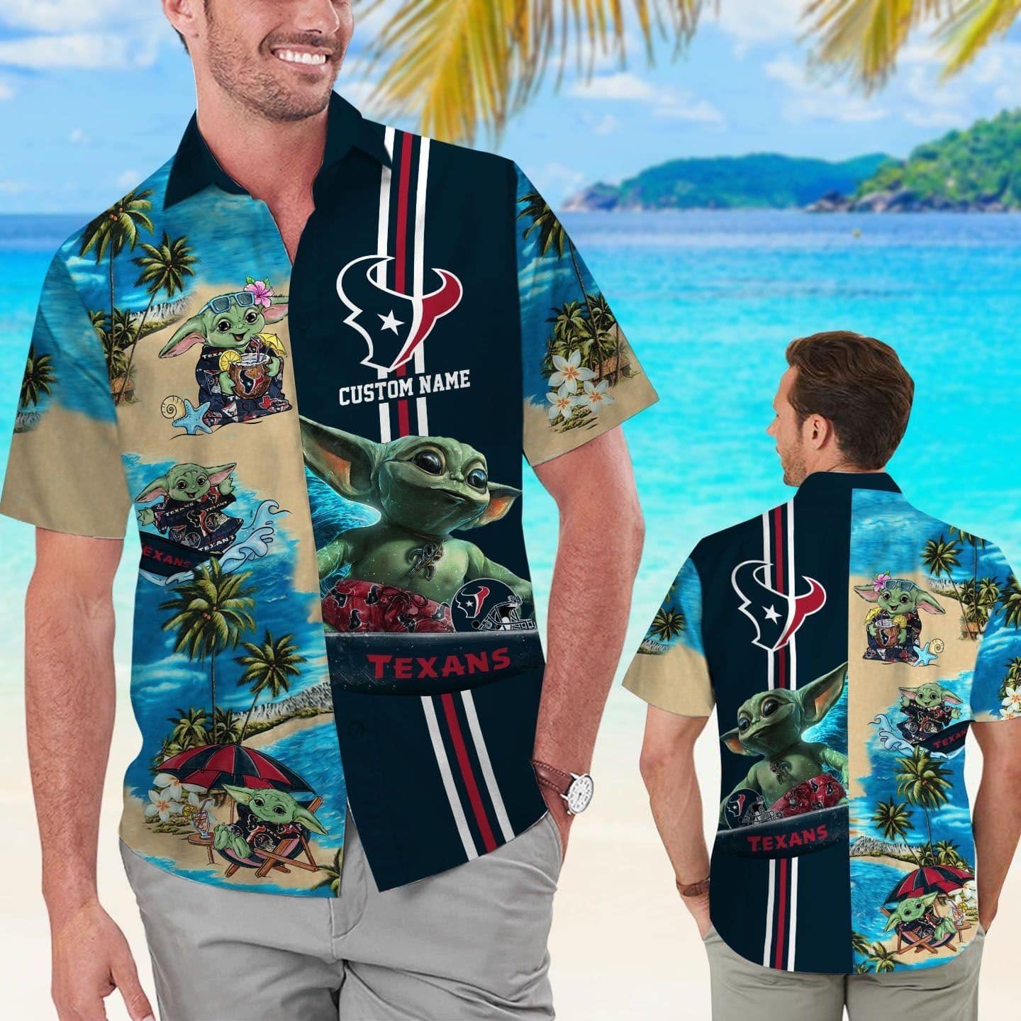 Houston Texans Baby Yoda Name Personalized Short Sleeve Button Up Tropical Hawaiian Shirt