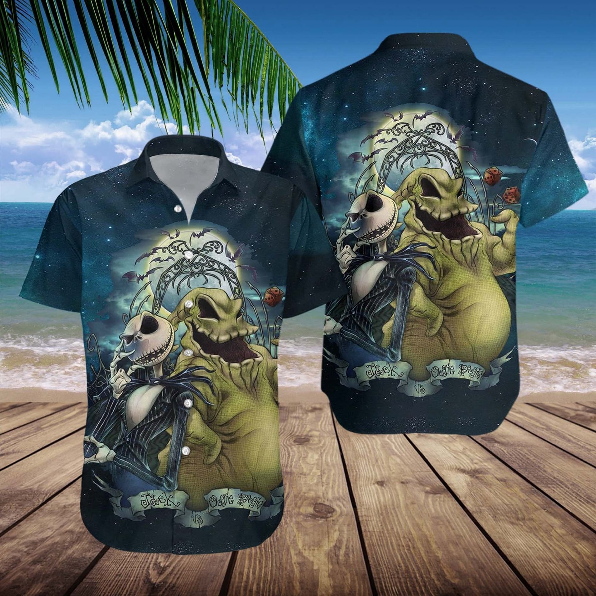 You’re viewing Jack Skellington And Oogie Boogie A Nightmare Before Christmas Hawaiian T Shirt.