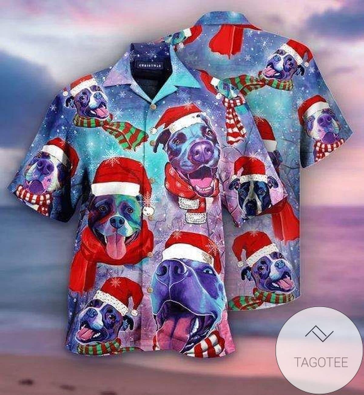 Jolly Santa Joined by Playful Pitbull on Blue Hawaiian Canvas
