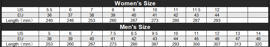 | Size | US5 – EU35, US5 – EU38, US5.5 – EU36, US6 – EU39, US6 – EU37, US7 – EU40, US7 – EU38, US7.5 – EU41, US8 – EU39, US8.5 – EU42, US9 – EU40, US9.5 – EU43, US10 – EU41, US10 – EU44, US11 – EU42, US11 – EU45, US11.5 – EU43, US12 – EU46, US12 – EU44, US13 – EU47, US14 – EU48 |