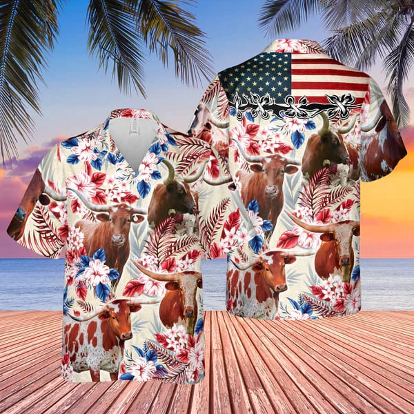 You’re viewing Longhorn Cattle American Flag Hawaiian Flowers 3D Trendy Hawaiian Shirt, Cow Trendy Hawaiian Shirt For Men And Women.