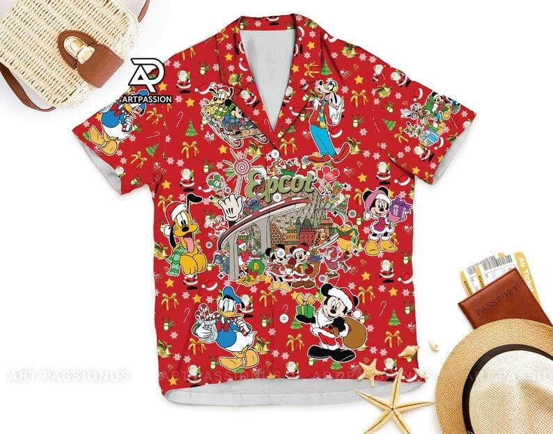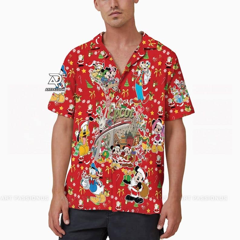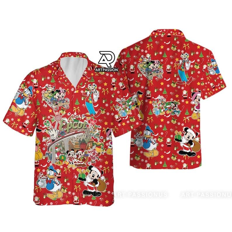Mickey Friends Epcot Hawaiian Christmas Disney Button Up Holiday Gifts Shirt