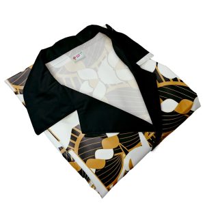 - Short sleeves, notch lapel collar, self-fabric sleeve cuff detail.