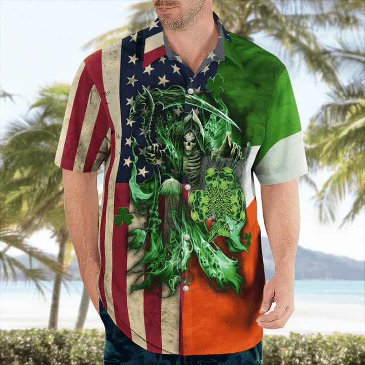St. Patrick’s Day Trendy Hawaiian Shirt, Irish Grim Reaper Irish Flag And American Flag Hawaii Shirt