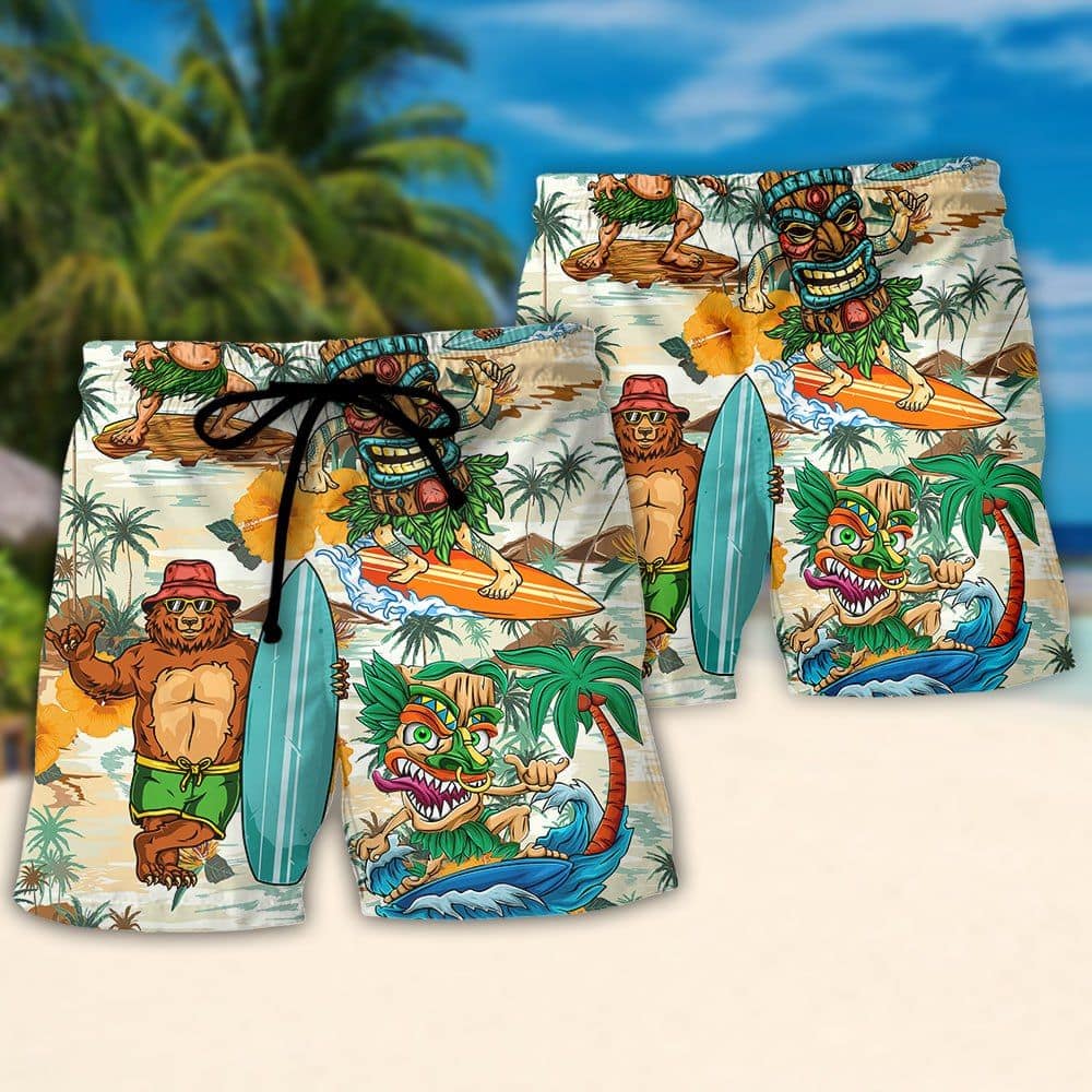 You’re viewing Surfing Funny Bear And Tiki Ride The Wave Follow The Sun Lovers Surfing Trendy KLA Hawaiian Beach Shorts.